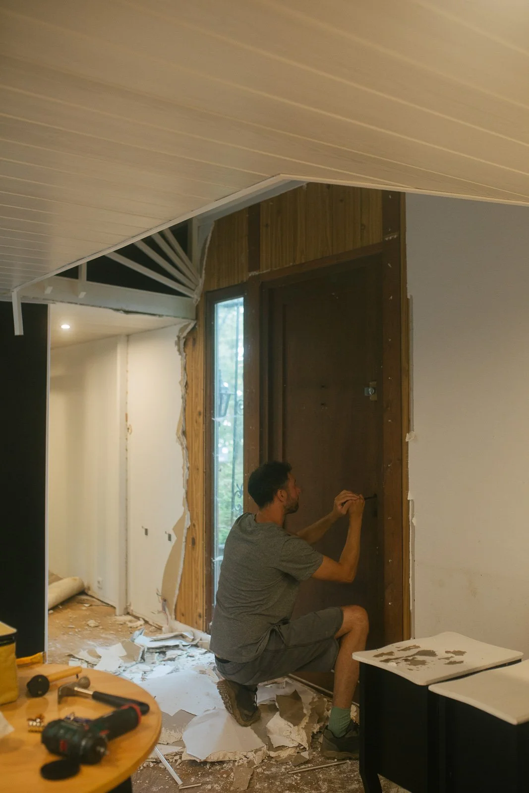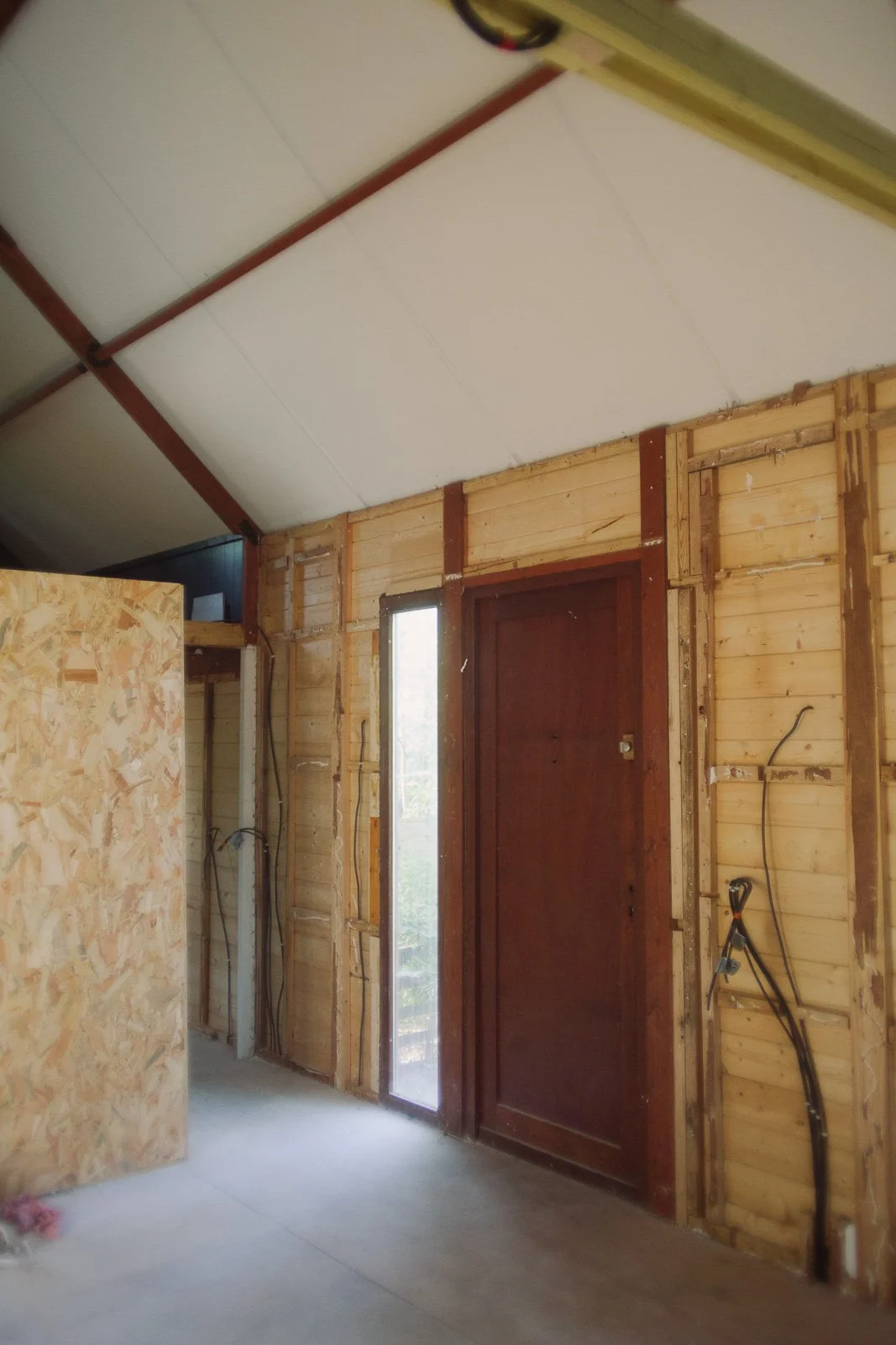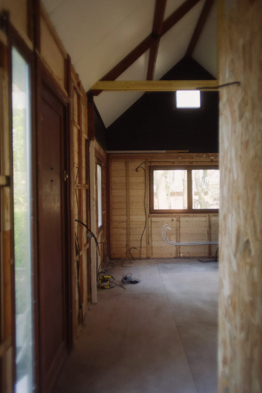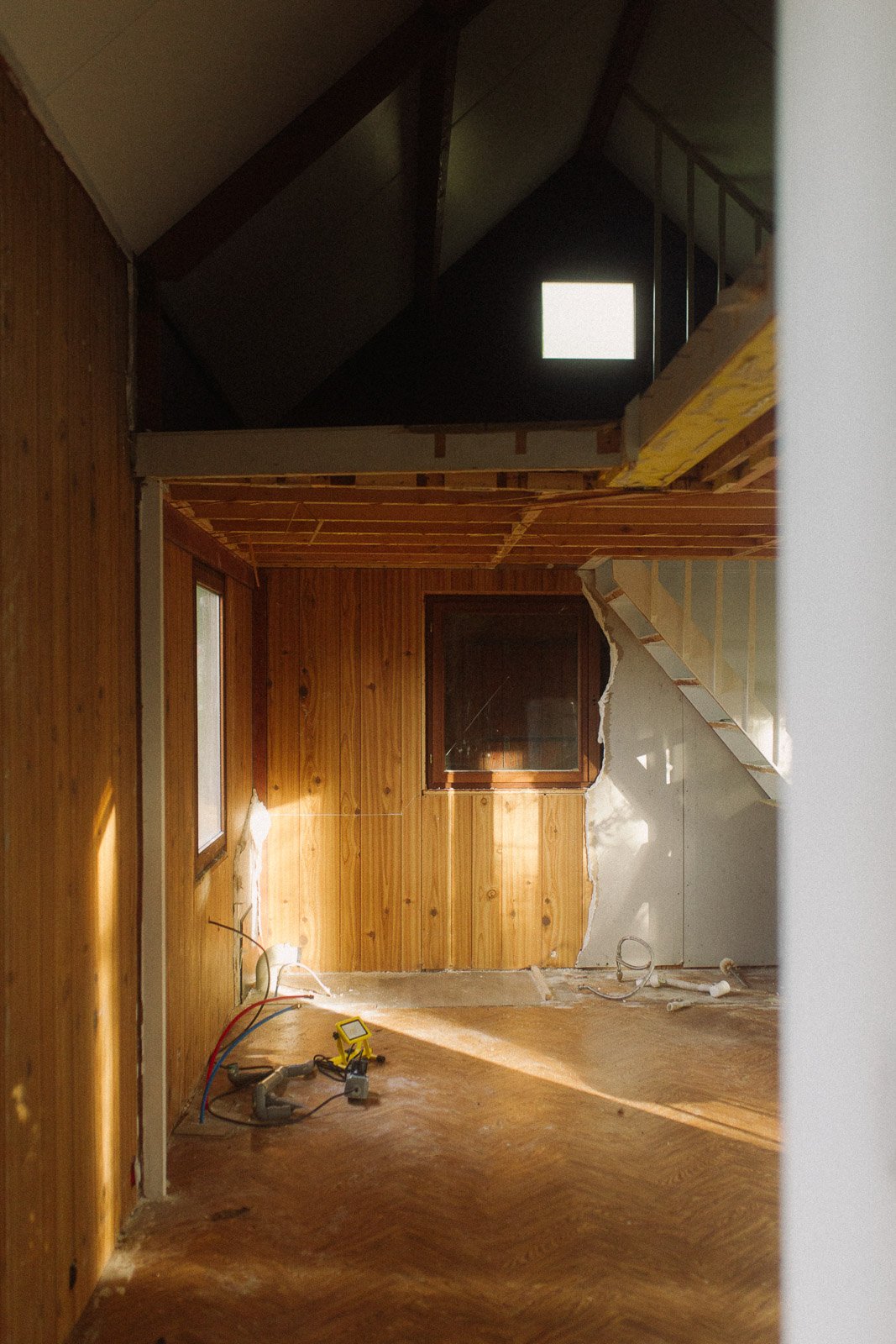 Pour l’anecdote, si ça semble évident aujourd’hui d’avoir voulu “tout casser”, ça ne l’était pas à la première visite. J’avais visité seule, j’avais trouvé ça “en l’état”, avec beaucoup de travail à réaliser comme l’élec, la plomberie, l’aménagement, mais rien d’insurmontable. Et puis vient la deuxième visite, avec Ben. On vérifie des points techniques sur l’avant du chalet (du style : mais comment ça se fait que ce truc n’ait pas encore brûlé ?), je monte sur la terrasse et j’aperçois le volet de gauche entrouvert. Et là tout s’éclaire et je me dis : “mais put*in il y a encore une fenêtre en dessous ?!”. On comprend alors que tout le placo à l’intérieur du chalet a été fixé à même les fenêtres, et que les travaux vont donc être bien plus importants que prévu (je dois l’avouer aujourd’hui - car il y a prescription - de mon côté je sautais intérieurement de joie car j’avais l’excuse PAR-FAI-TE pour justifier le fait de tout démonter et de passer sur un intérieur en bois comme j’en rêvais).