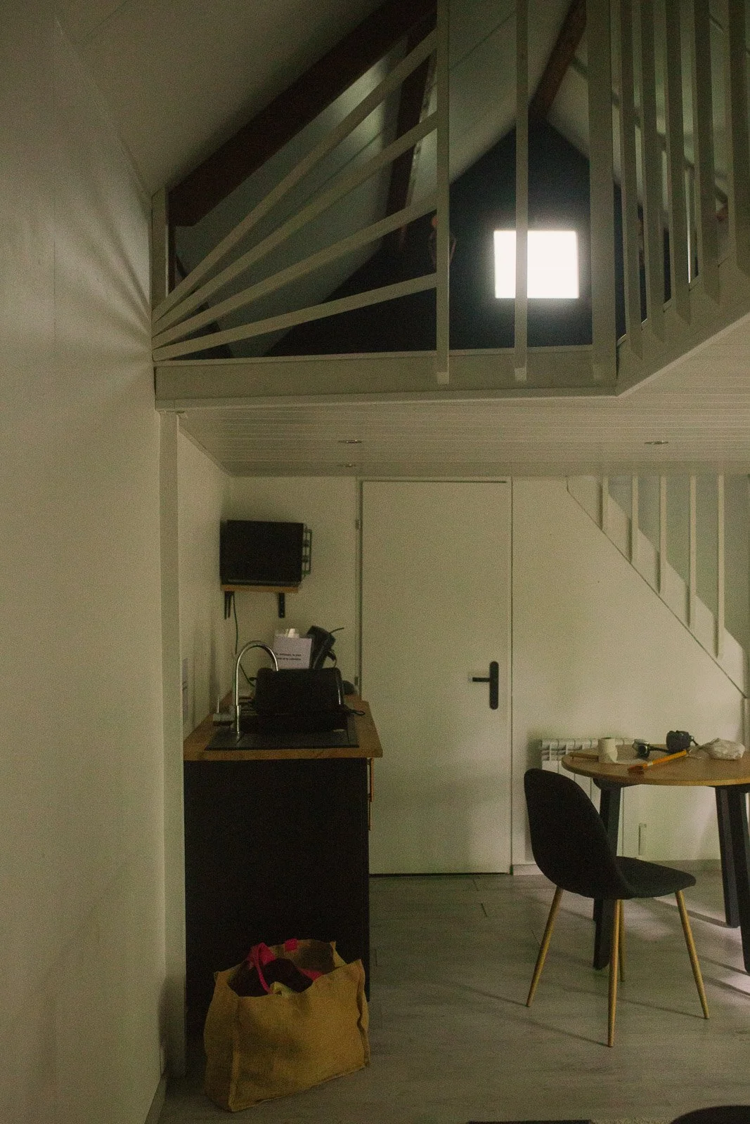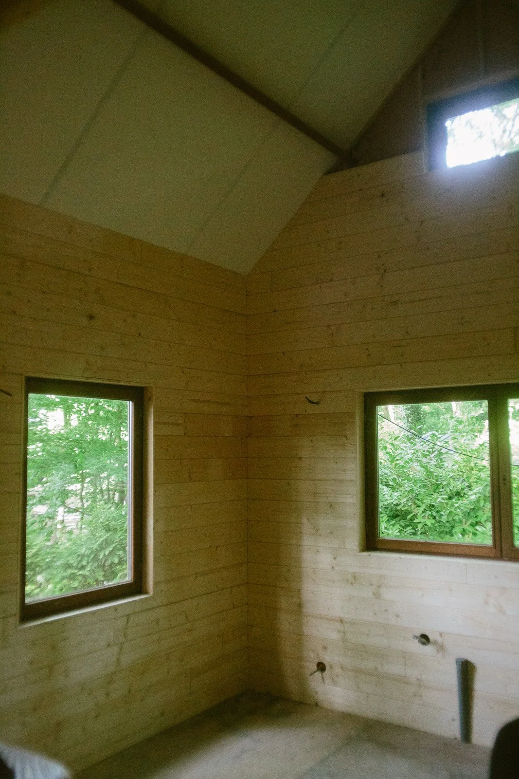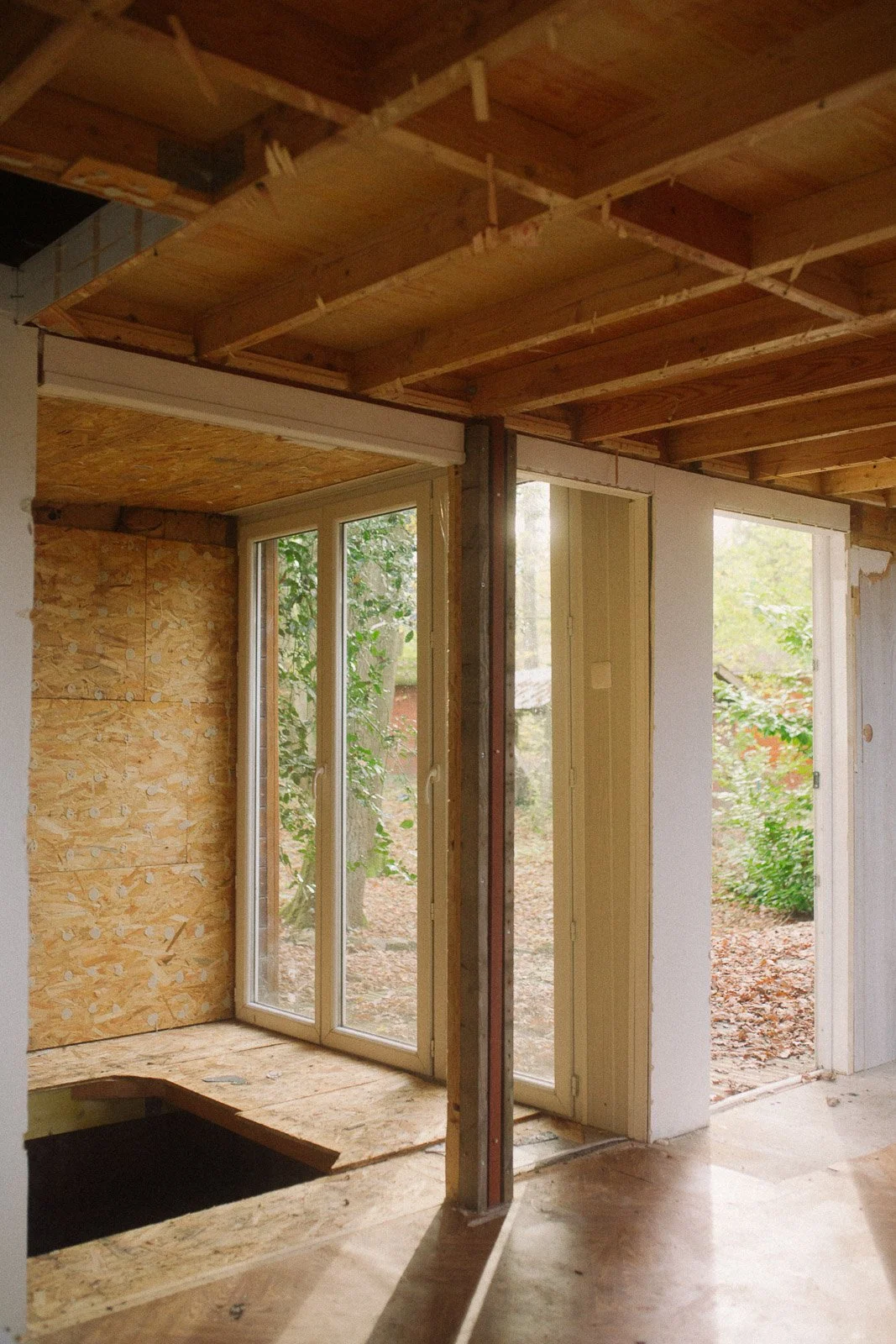 Pour l’anecdote, si ça semble évident aujourd’hui d’avoir voulu “tout casser”, ça ne l’était pas à la première visite. J’avais visité seule, j’avais trouvé ça “en l’état”, avec beaucoup de travail à réaliser comme l’élec, la plomberie, l’aménagement, mais rien d’insurmontable. Et puis vient la deuxième visite, avec Ben. On vérifie des points techniques sur l’avant du chalet (du style : mais comment ça se fait que ce truc n’ait pas encore brûlé ?), je monte sur la terrasse et j’aperçois le volet de gauche entrouvert. Et là tout s’éclaire et je me dis : “mais put*in il y a encore une fenêtre en dessous ?!”. On comprend alors que tout le placo à l’intérieur du chalet a été fixé à même les fenêtres, et que les travaux vont donc être bien plus importants que prévu (je dois l’avouer aujourd’hui - car il y a prescription - de mon côté je sautais intérieurement de joie car j’avais l’excuse PAR-FAI-TE pour justifier le fait de tout démonter et de passer sur un intérieur en bois comme j’en rêvais).