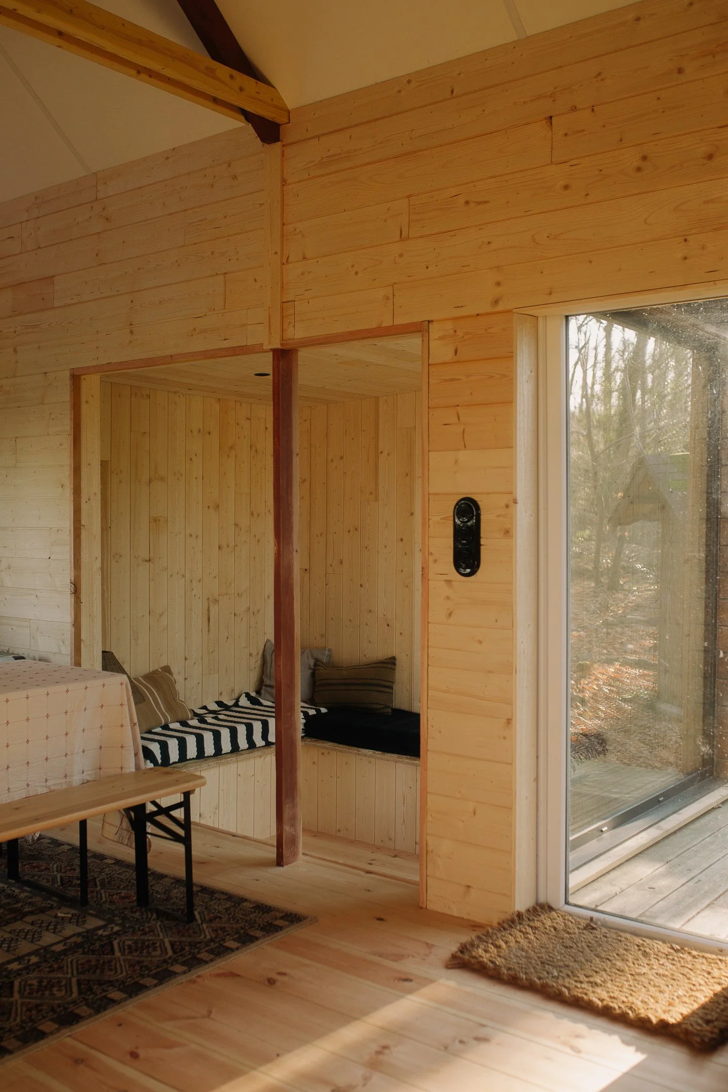 On a décidé de se faciliter la vie en gardant la pièce en demi-niveau (elle est plus basse que le reste du chalet). L’idée sera d’installer une banquette en U (gros teasing en photo 4 !) et de remplacer la baie en PVC (photo 2) par une fenêtre fixe pleine sans montant, pour une vue plus immersive sur la forêt.