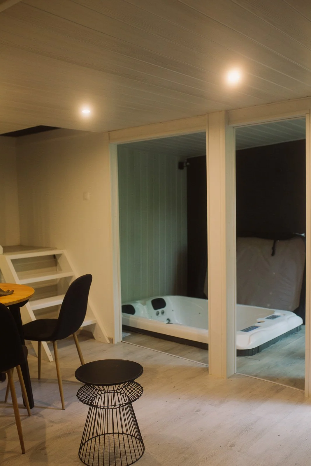 En photo 1, l’espace avant, avec le petit jacuzzi ouvert sur la cuisine, histoire de respirer les bonnes odeurs de chlore pendant l’apéro ! Heureusement pour nous, le mur du fond derrière le jacuzzi avait été fait à la va-vite. Il a été assez simple à démonter. Le plus dur aura été de porter les 190 kilos de la bête, et de le monter sur le hardtop du 4x4 de l’acheteur leboncoin.